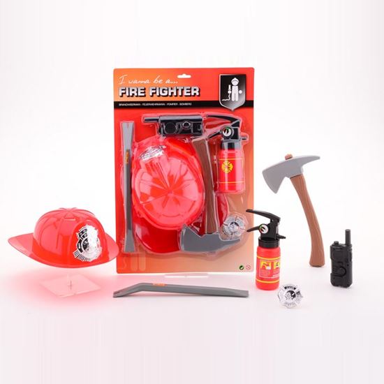 composé de 6 articles différents: casque de pompier, pied de biche, extincteur, badge, hache et talkie-walkie.