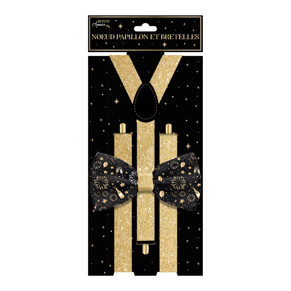 Le pack comporte une paire de bretelles à paillettes dorées et un noeud papillon avec une bande élastique ajustable noire. Ce dernier est noir avec un motif d’objets et d’éléments festifs dorés autour.